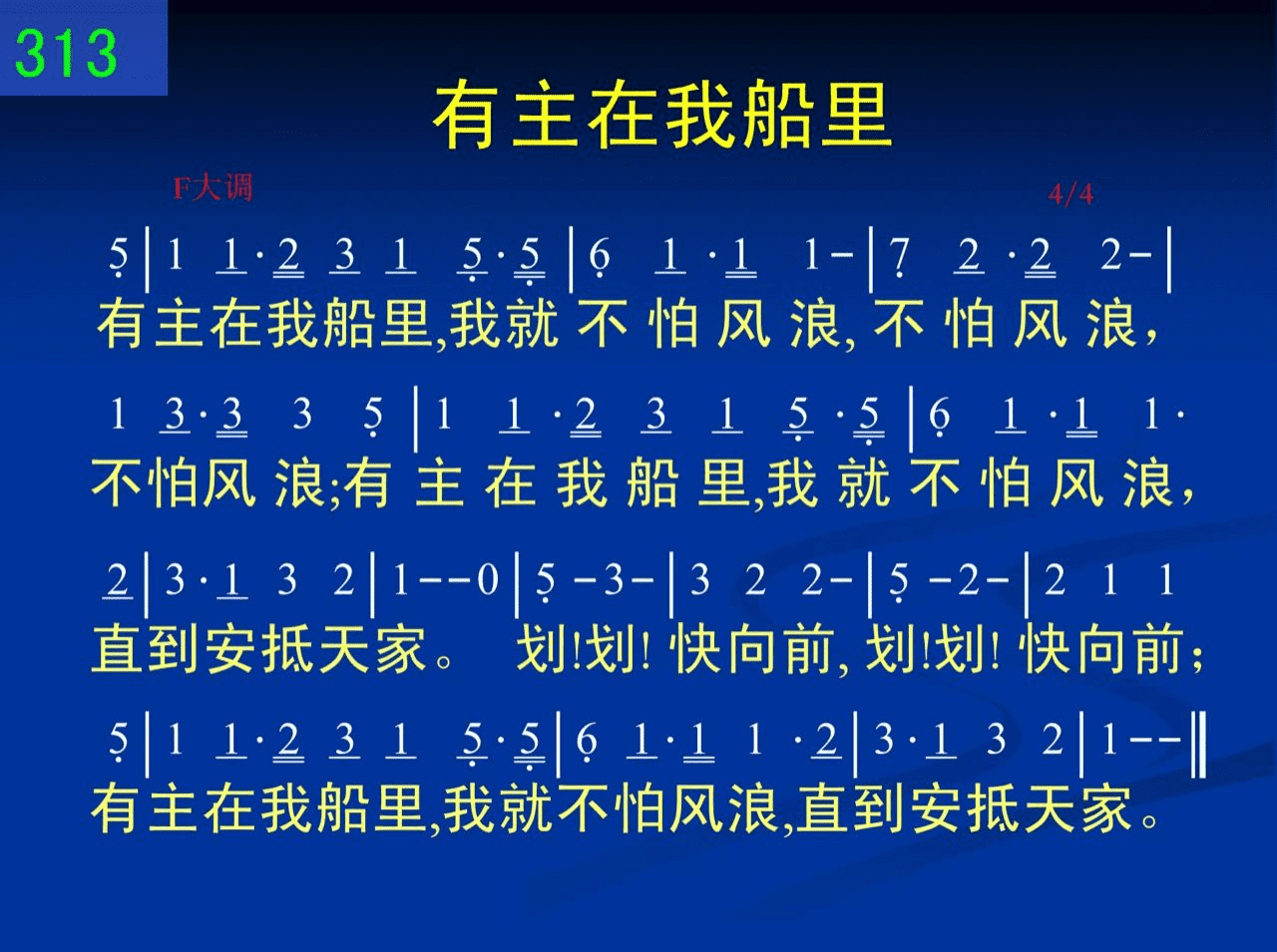 有主在我船里,我就不怕风浪,不怕风浪,不怕风浪;有主在我船里,我就不怕风浪,直到安抵天家。划!划!快向前,划!划!快向前;有主在我船里,我就不怕风浪,直到安抵天家。