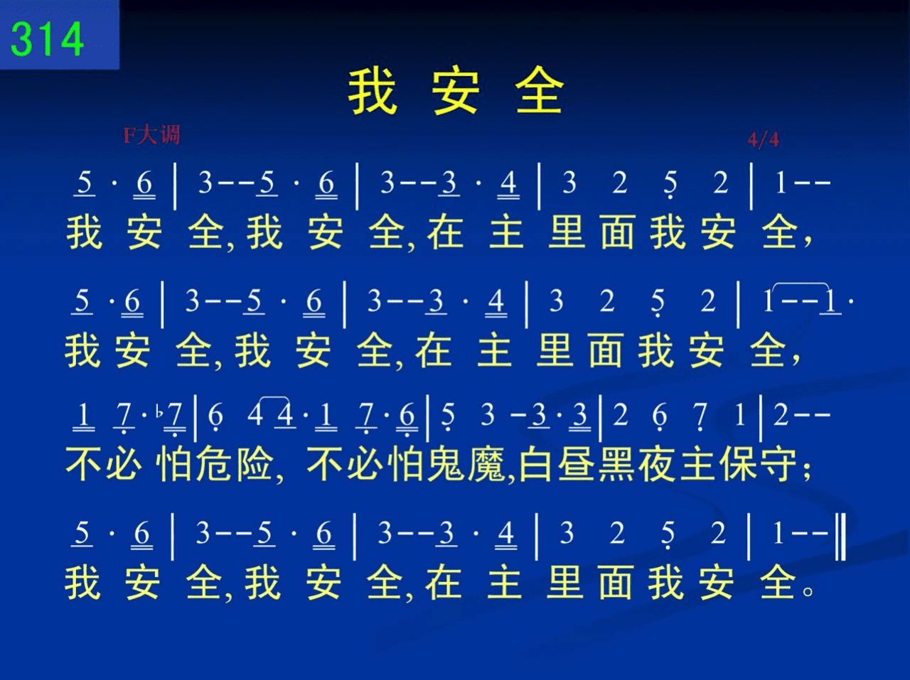 我安全,我安全,在主里面我安全,我安全,我安全,在主里面我安全,不必怕危险,不必怕鬼魔,白昼黑夜主保守;我安全,我安全,在主里面我安全。