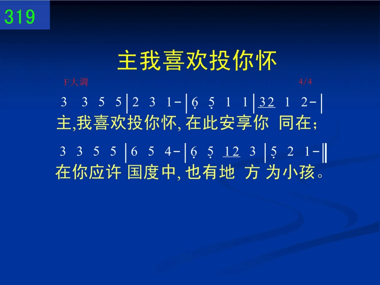 主,我喜欢投你怀,在此安享你同在;在你应许国度中,也有地方为小孩。
