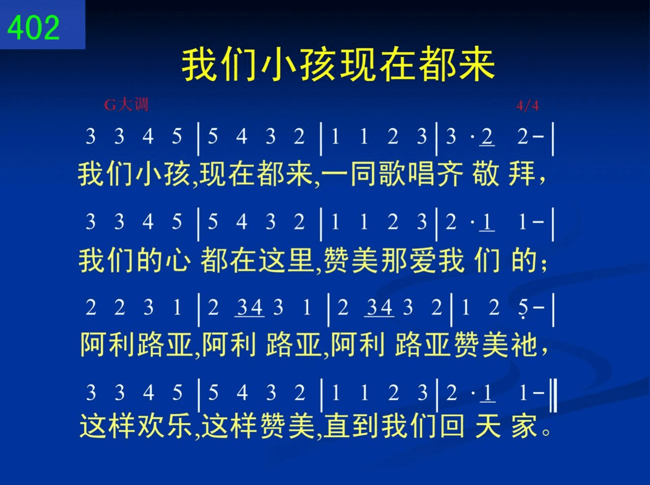 我们小孩,现在都来,一同歌唱齐敬拜,我们的心都在这里,赞美那爱我们的;阿利路亚,阿利路亚,阿利路亚赞美祂,这样欢乐,这样赞美,直到我们回天家。