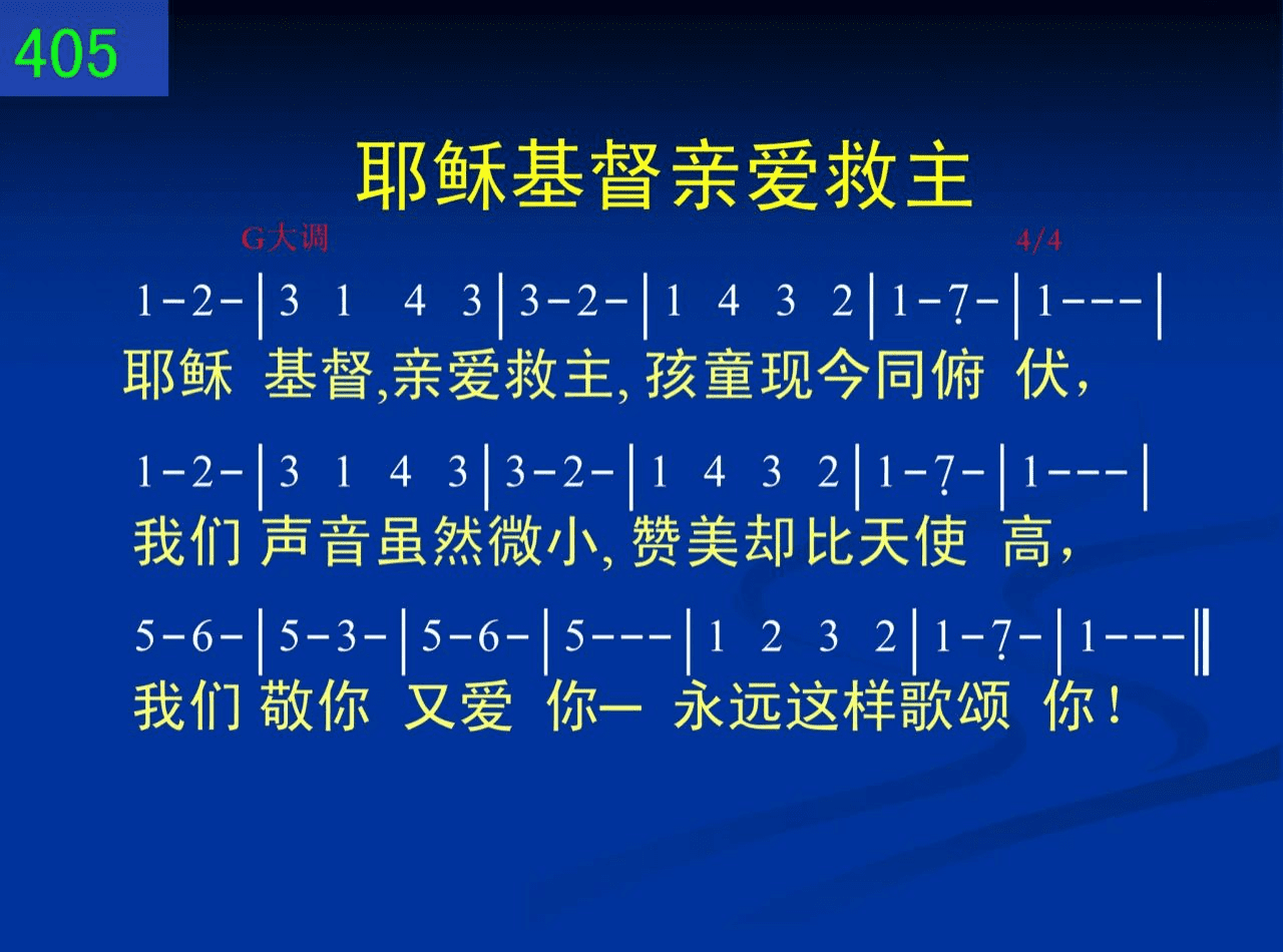 耶稣基督,亲爱救主,孩童现今同俯伏,我们声音虽然微小,赞美却比天使高,我们敬你又爱你─永远这样歌颂你!