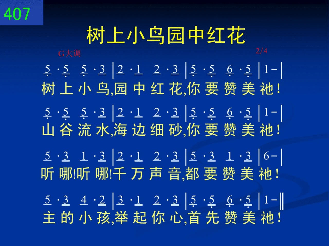 树上小鸟,园中红花,你要赞美祂!山谷流水,海边细砂,你要赞美祂!听哪!听哪!千万声音,都要赞美祂!主的小孩,举起你心,首先赞美祂!