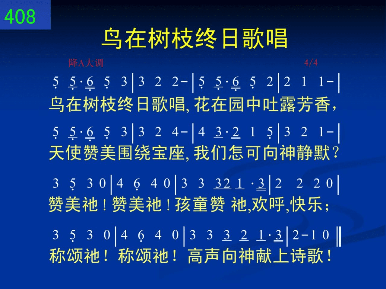 鸟在树枝终日歌唱,花在园中吐露芳香,天使赞美围绕宝座,我们怎可向神静默?赞美祂!赞美祂!孩童赞祂,欢呼,快乐;称颂祂!称颂祂!高声向神献上诗歌!