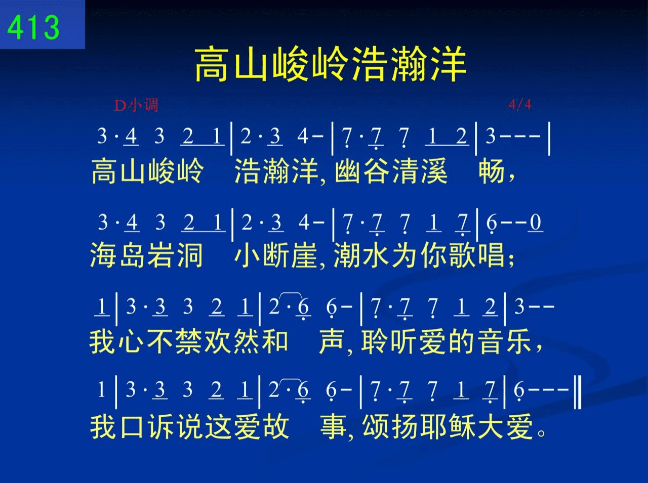 高山峻岭浩瀚洋,幽谷清溪畅,海岛岩洞小断崖,潮水为你歌唱;我心不禁欢然和声,聆听爱的音乐,我口诉说这爱故事,颂扬耶稣大爱。