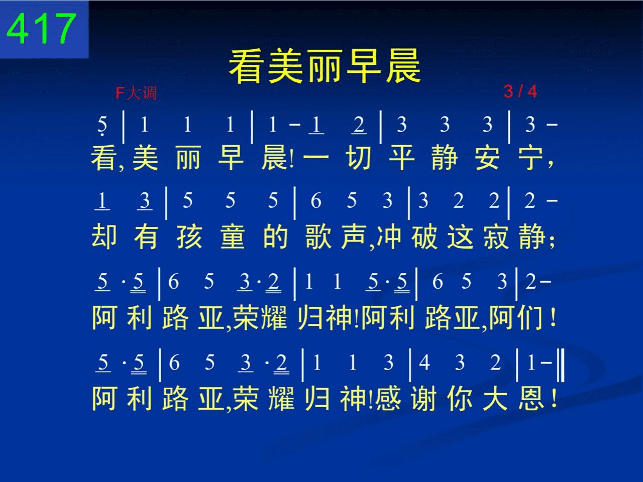 看,美丽早晨!一切平静安宁,却有孩童的歌声,冲破这寂静;阿利路亚,荣耀归神!阿利路亚,阿们!阿利路亚,荣耀归神!感谢你大恩!