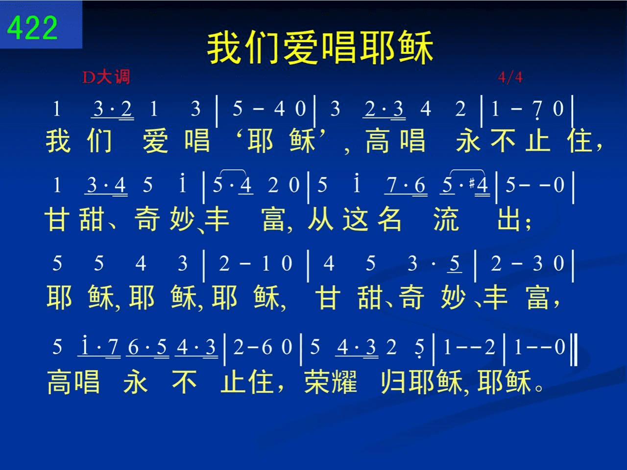 我们爱唱‘耶稣’,高唱永不止住,甘甜、奇妙、丰富,从这名流出;耶稣,耶稣,耶稣,甘甜、奇妙、丰富,高唱永不止住,荣耀归耶稣,耶稣。