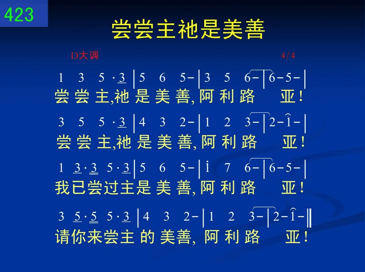 尝尝主,祂是美善,阿利路亚!尝尝主,祂是美善,阿利路亚!我已尝过主是美善,阿利路亚!请你来尝主的美善,阿利路亚!