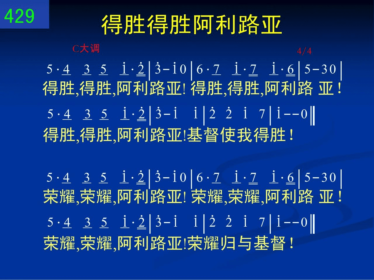得胜,得胜,阿利路亚!得胜,得胜,阿利路亚!得胜,得胜,阿利路亚!基督使我得胜!荣耀,荣耀,阿利路亚!荣耀,荣耀,阿利路亚!荣耀,荣耀,阿利路亚!荣耀归与基督!