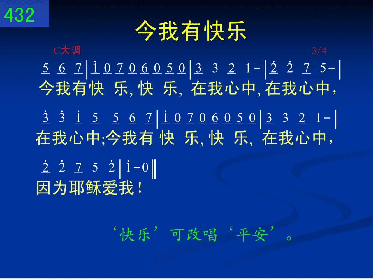 今我有快乐,快乐,在我心中,在我心中,在我心中;今我有快乐,快乐,在我心中,因为耶稣爱我!