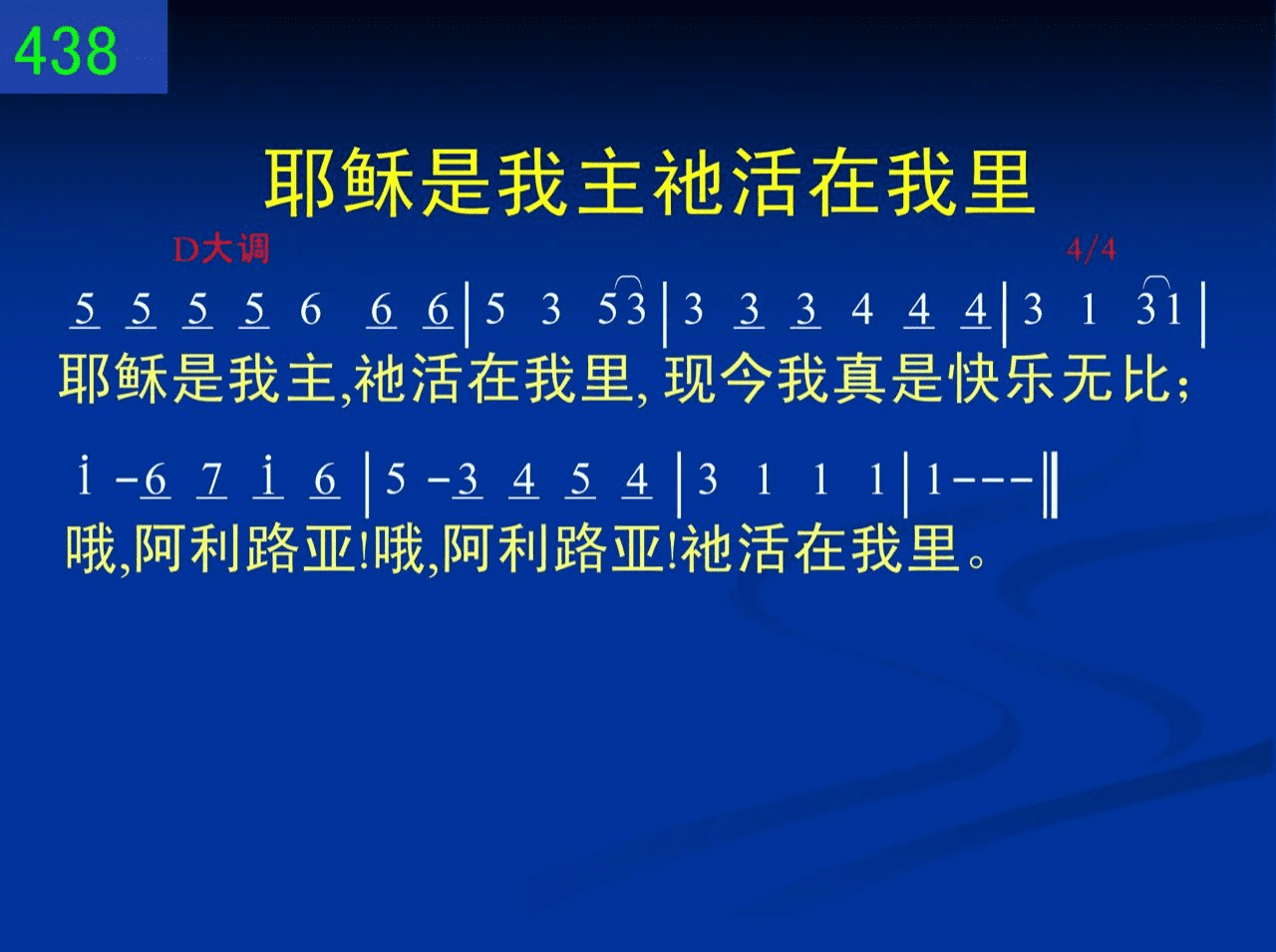 耶稣是我主,祂活在我里,现今我真是快乐无比;哦,阿利路亚!哦,阿利路亚!祂活在我里。