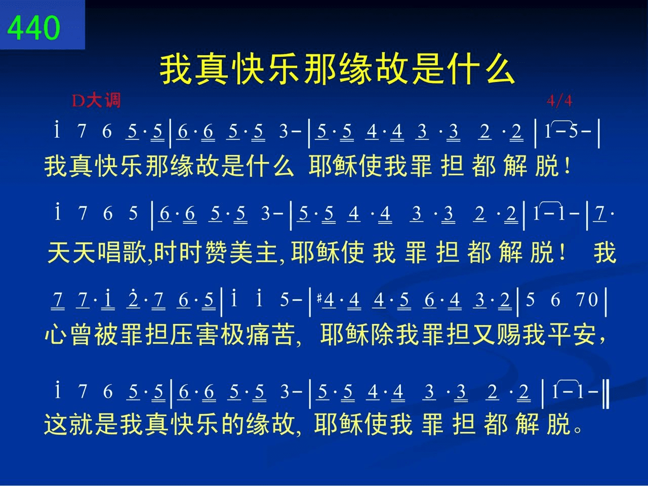 我真快乐那缘故是什么?耶稣使我罪担都解脱!天天唱歌,时时赞美主,耶稣使我罪担都解脱!我心曾被罪担压害极痛苦,耶稣除我罪担又赐我平安,这就是我真快乐的缘故,耶稣使我罪担都解脱。