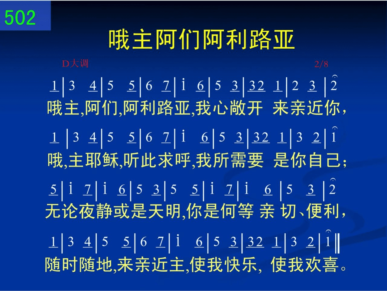 哦主,阿们,阿利路亚,我心敞开来亲近你,哦,主耶稣,听此求呼,我所需要是你自己;无论夜静或是天明,你是何等亲切、便利,随时随地,来亲近主,使我快乐,使我欢喜。