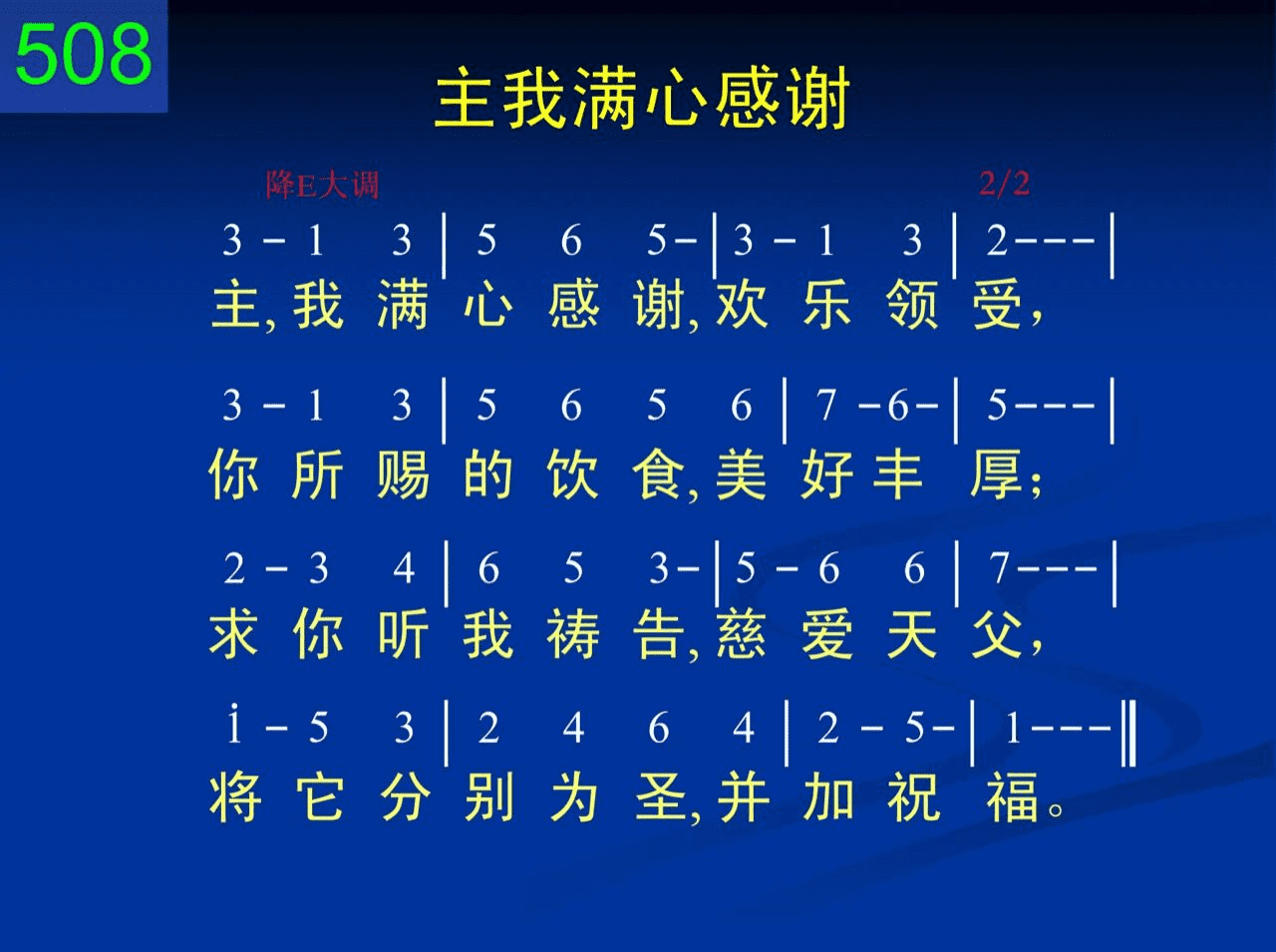 主,我满心感谢,欢乐领受,你所赐的饮食,美好丰厚;求你听我祷告,慈爱天父,将它分别为圣,并加祝福。