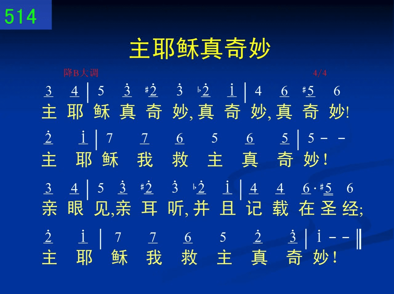 主耶稣真奇妙,真奇妙,真奇妙!主耶稣我救主真奇妙!亲眼见,亲耳听,并且记载在圣经;主耶稣我救主真奇妙!