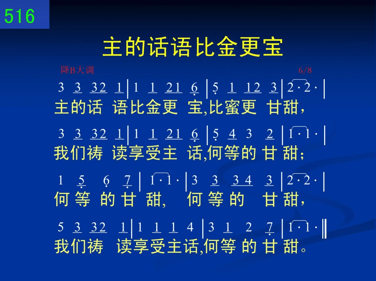 主的话语比金更宝,比蜜更甘甜,我们祷读享受主话,何等的甘甜;何等的甘甜,何等的甘甜,我们祷读享受主话,何等的甘甜。