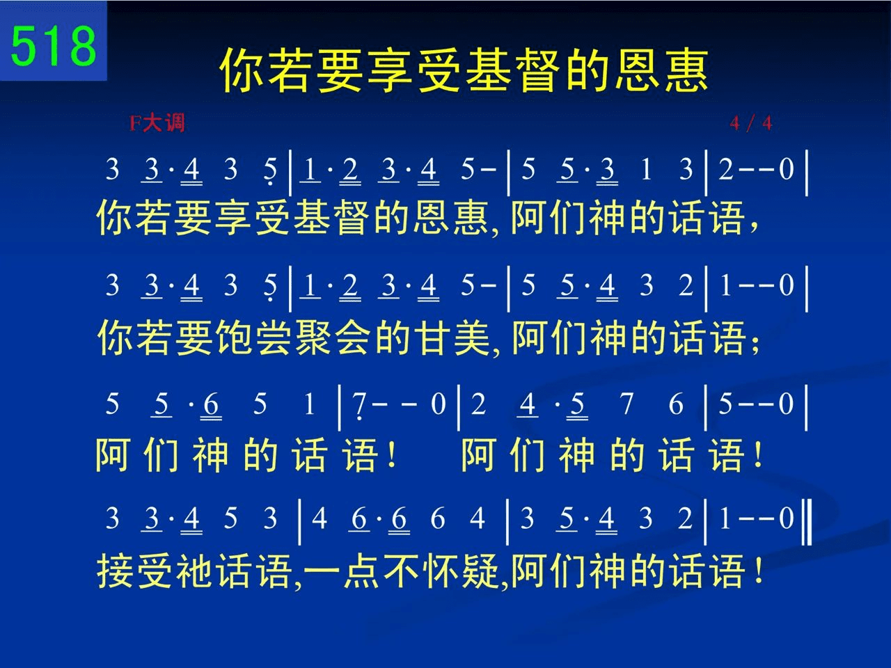 你若要享受基督的恩惠,阿们神的话语,你若要饱尝聚会的甘美,阿们神的话语;阿们神的话语,阿们神的话语,接受祂话语,一点不怀疑,阿们神的话语。