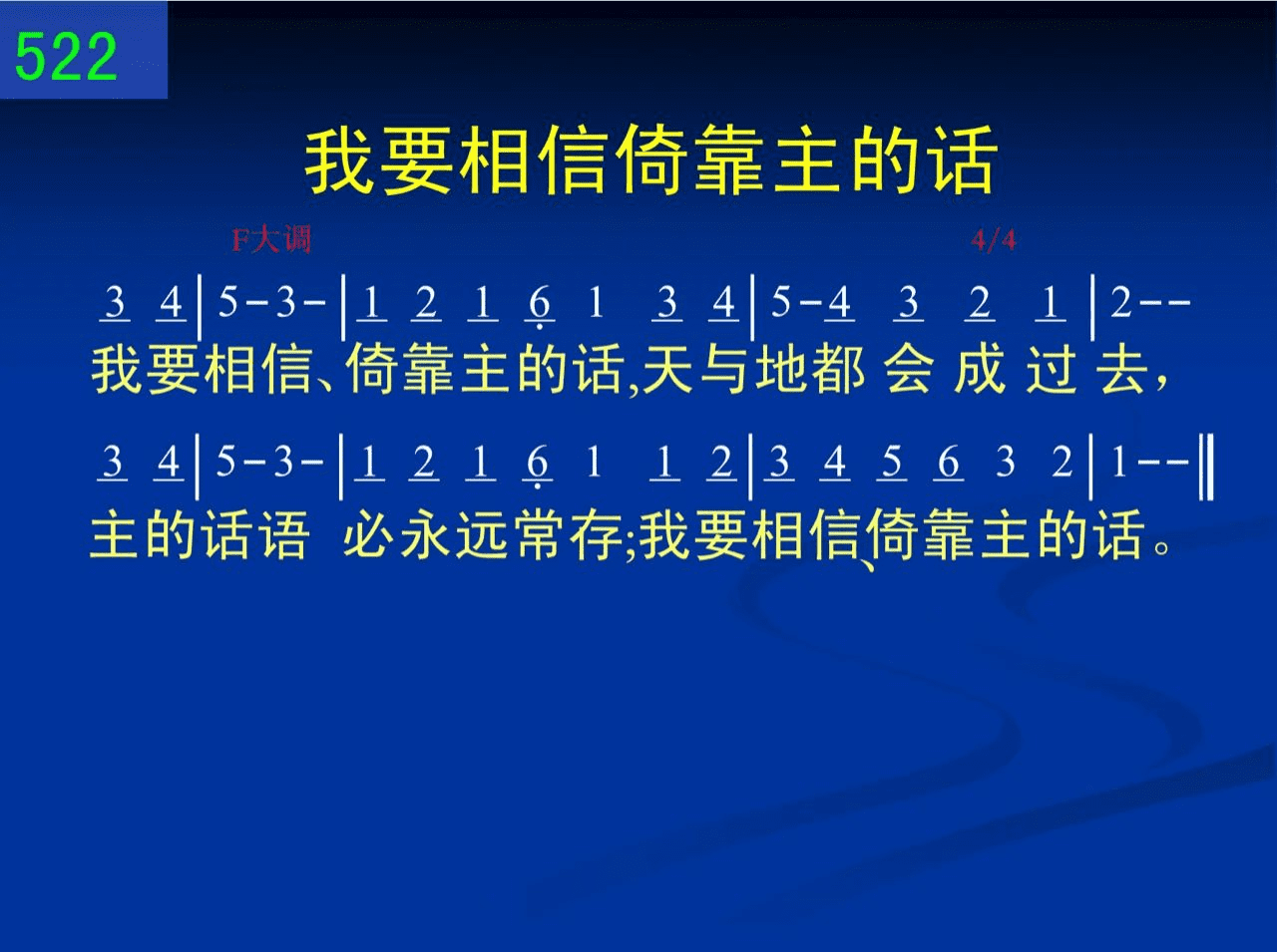 我要相信、倚靠主的话,天与地都会成过去,主的话语必永远常存;我要相信、倚靠主的话。