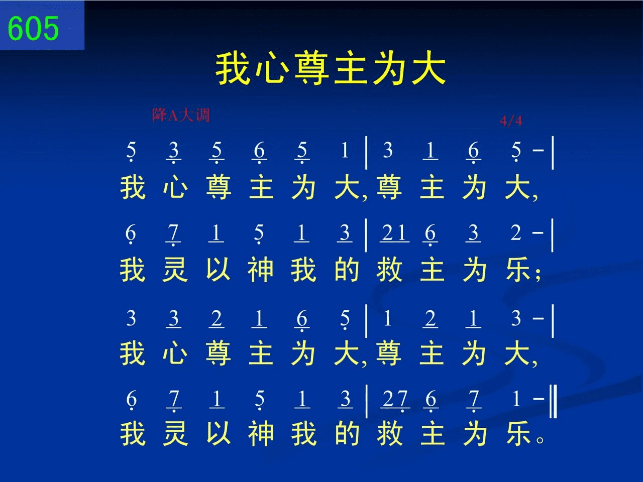 我心尊主为大,尊主为大,我灵以神我的救主为乐;我心尊主为大,尊主为大,我灵以神我的救主为乐。