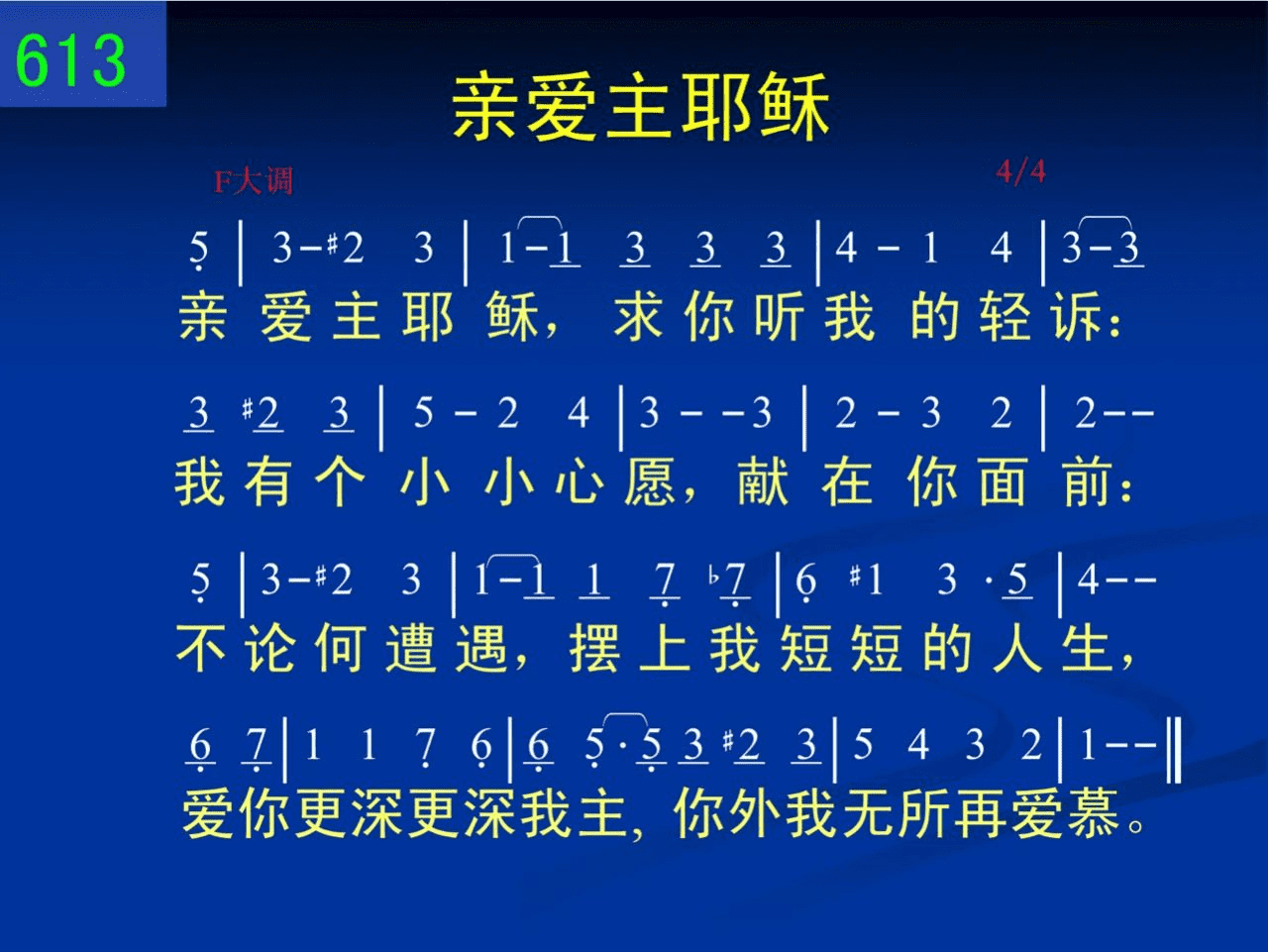 亲爱主耶稣,求你听我的轻诉:我有个小小心愿,献在你面前:不论何遭遇,摆上我短短的人生,爱你更深更深我主,你外我无所再爱慕。