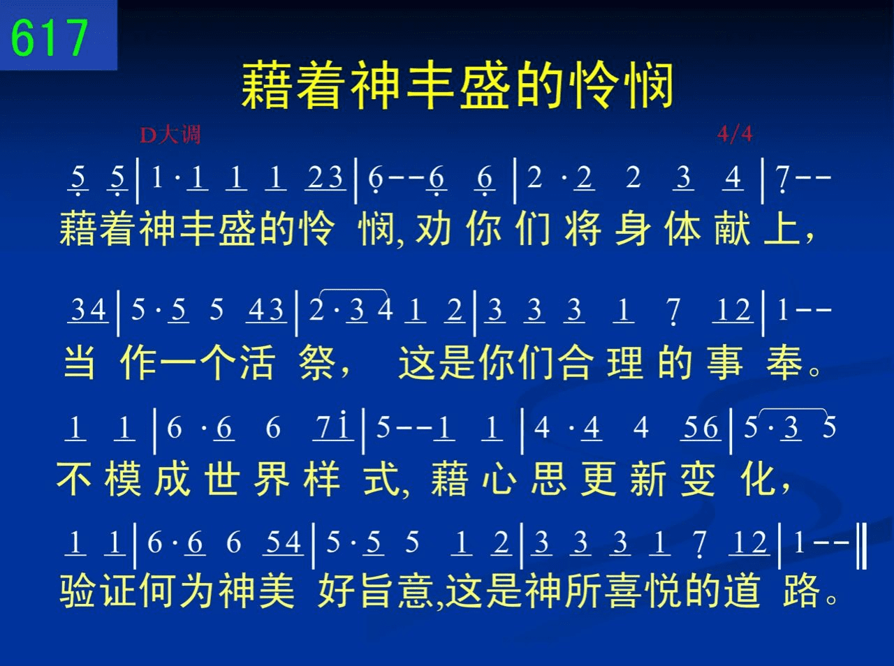 藉着神丰盛的怜悯,劝你们将身体献上,当作一个活祭,这是你们合理的事奉。不模成世界样式,藉心思更新变化,验证何为神美好旨意,这是神所喜悦的道路。