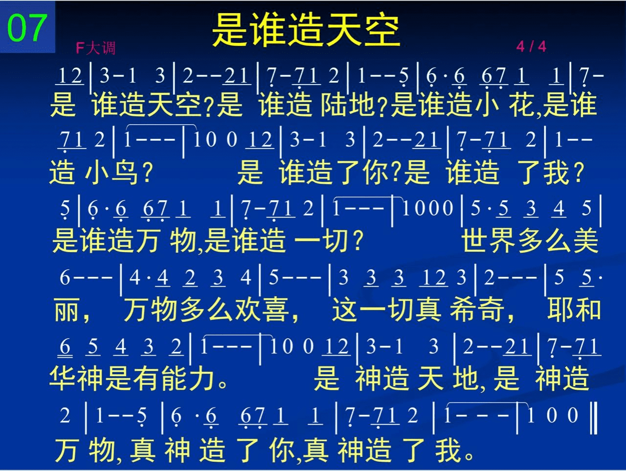 是谁造天空?是谁造陆地?是谁造小花,是谁造小鸟?是谁造了你?是谁造了我?是谁造万物,是谁阅慊切?世界多么美丽,万物多么欢喜,这一切真希奇,耶和华神是有能力。是神造天地,是神造万物,真神造了你,真神造了我。