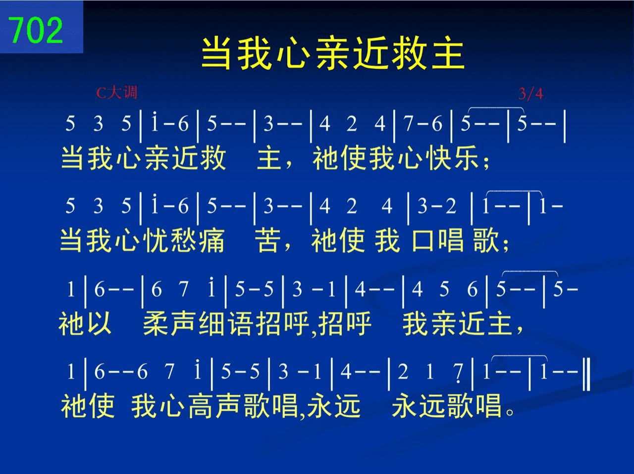 当我心亲近救主,祂使我心快乐;当我心忧愁痛苦,祂使我口唱歌;祂以柔声细语招呼,招呼我亲近主,祂使我心高声歌唱,永远永远歌唱。