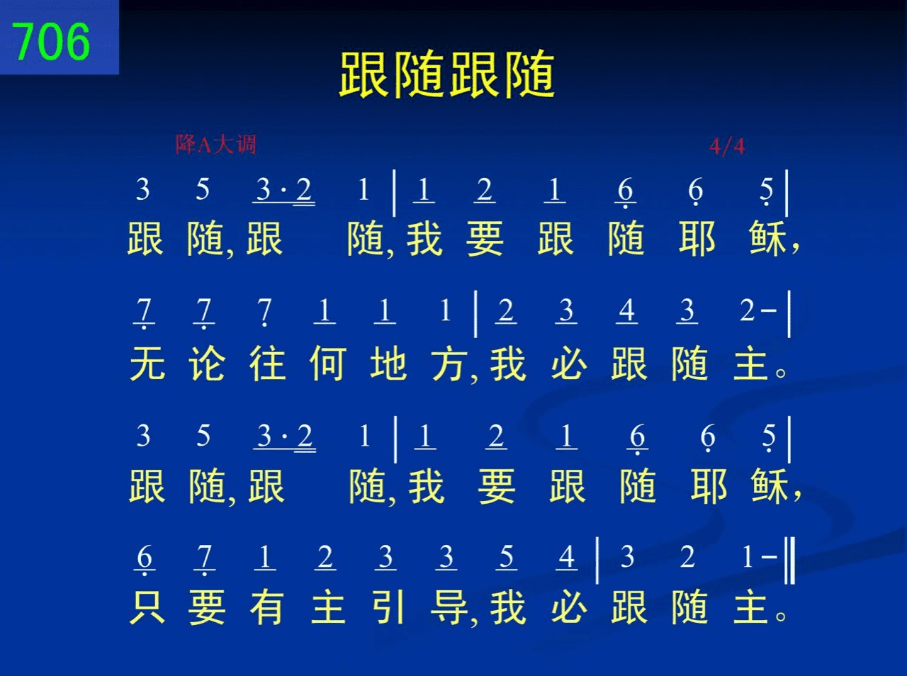 跟随,跟随,我要跟随耶稣,无论往何地方,我必跟随主。跟随,跟随,我要跟随耶稣,只要有主引导,我必跟随主。