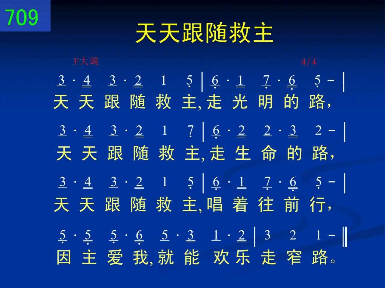 天天跟随救主,走光明的路,天天跟随救主,走生命的路,天天跟随救主,唱着往前行,因主爱我,就能欢乐走窄路。