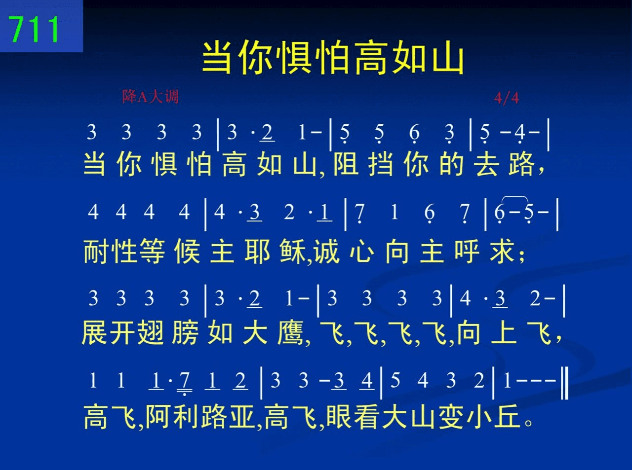 当你惧怕高如山,阻挡你的去路,耐性等候主耶稣,诚心向主呼求;展开翅膀如大鹰,飞,飞,飞,飞,向上飞,高飞,阿利路亚,高飞,眼看大山变小丘。