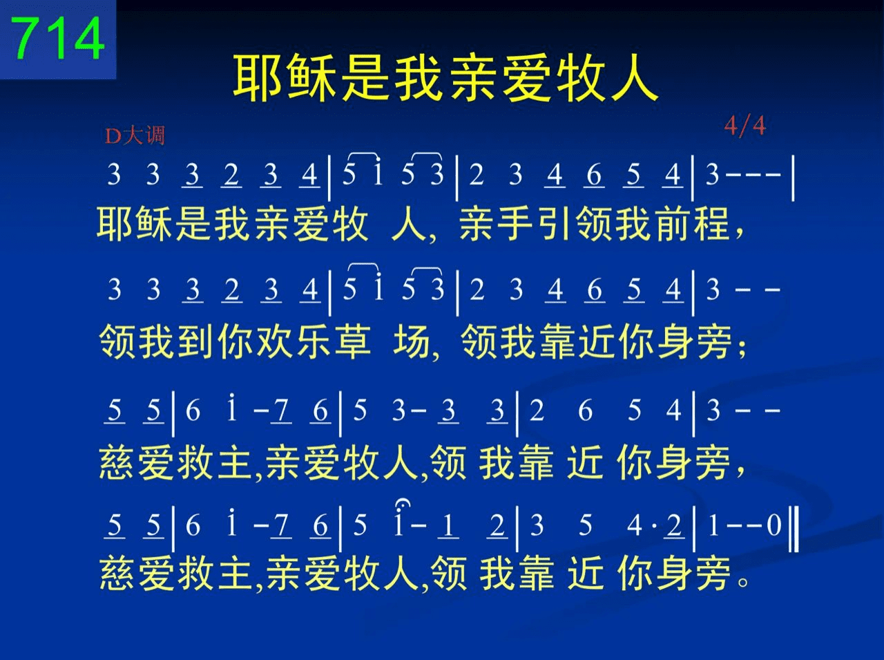 耶稣是我亲爱牧人,亲手引领我前程,领我到你欢乐草场,领我靠近你身旁;慈爱救主,亲爱牧人,领我靠近你身旁,慈爱救主,亲爱牧人,领我靠近你身旁。