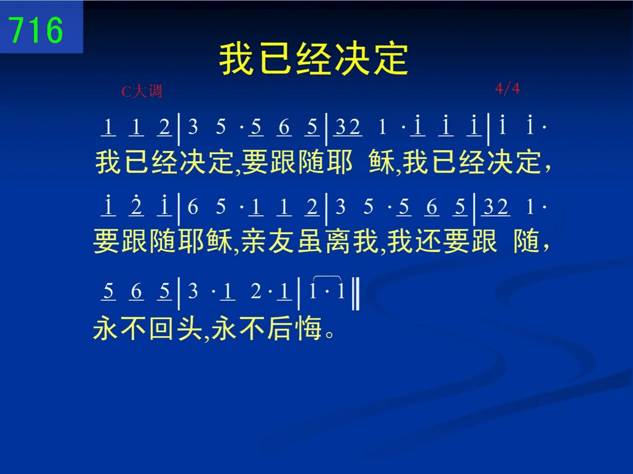我已经决定,要跟随耶稣,我已经决定,要跟随耶稣,亲友虽离我,我还要跟随,永不回头,永不后悔。