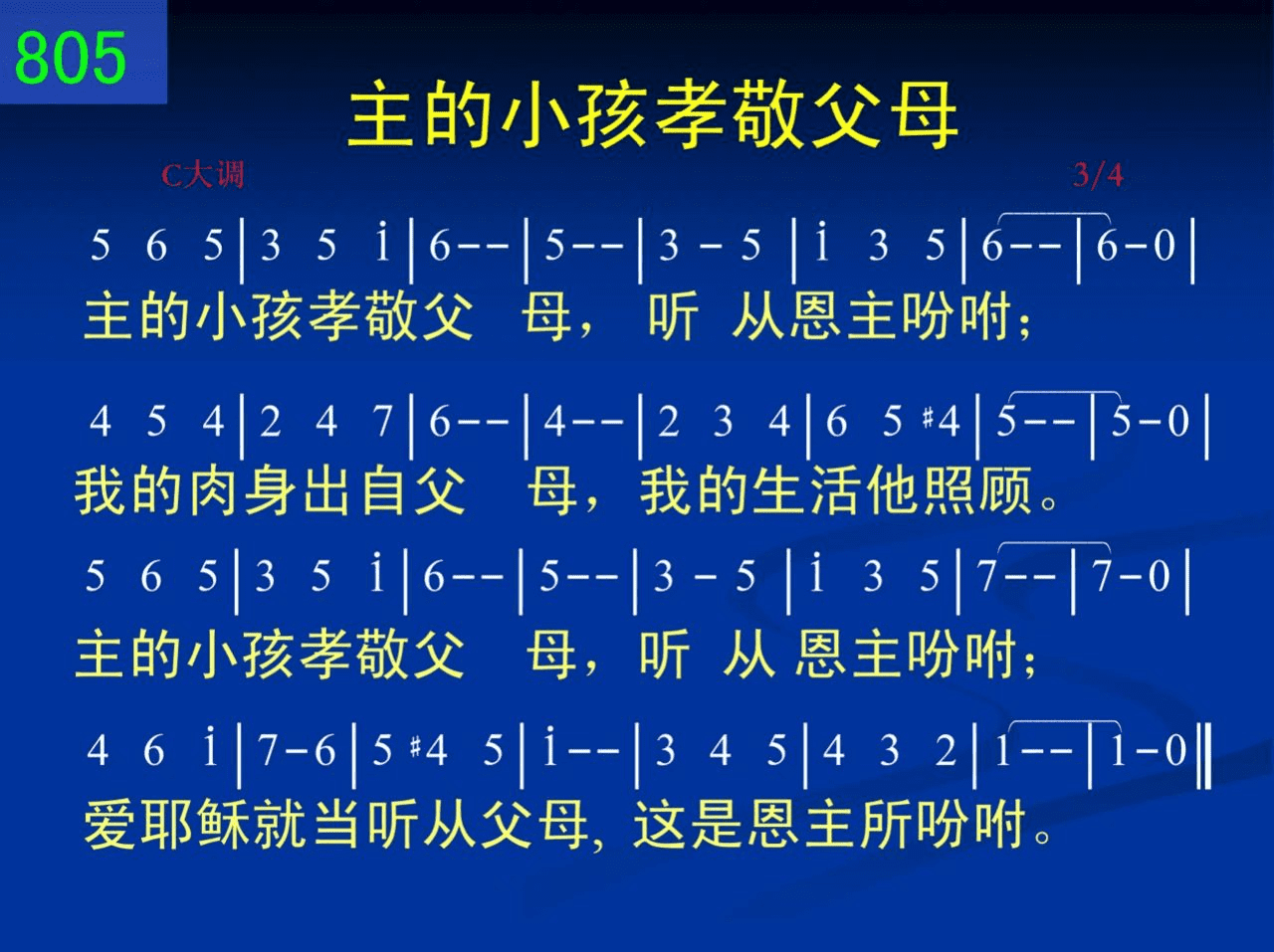 主的小孩孝敬父母,听从恩主吩咐;我的肉身出自父母,我的生活他照顾。主的小孩孝敬父母,听从恩主吩咐;爱耶稣就当听从父母,这是恩主所吩咐。