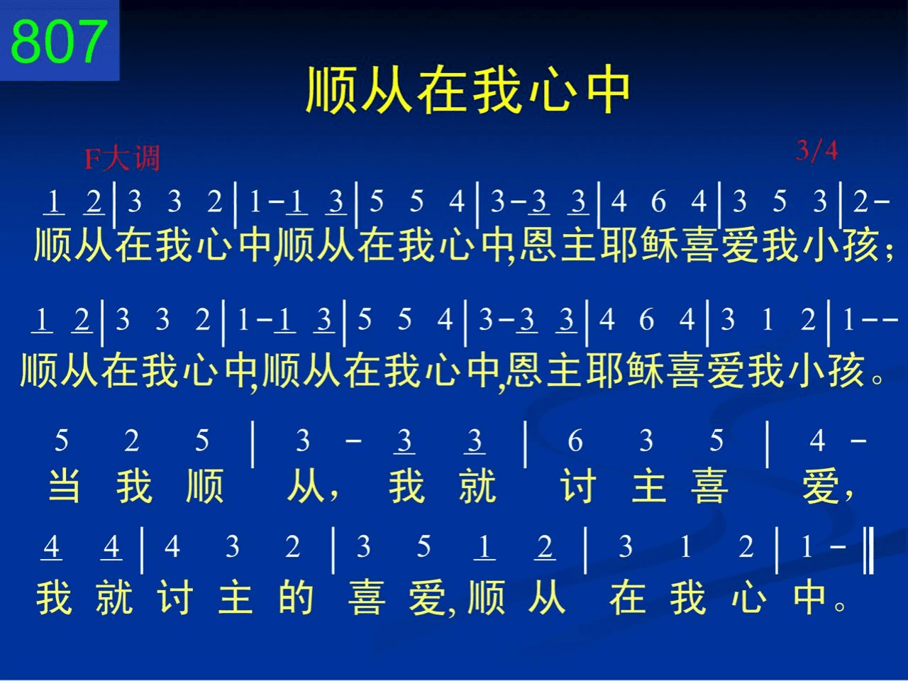 顺从在我心中,顺从在我心中,恩主耶稣喜爱我小孩;顺从在我心中,顺从在我心中,恩主耶稣喜爱我小孩。当我顺从,我就讨主喜爱,我就讨主的喜爱,顺从在我心中。