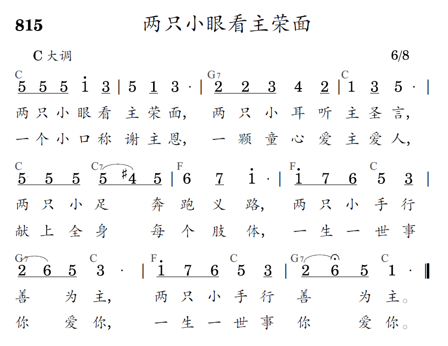 两只小眼看主荣面,两只小耳听主圣言,两只小足奔跑义路,两只小手行善为主,两只小手行善为主。