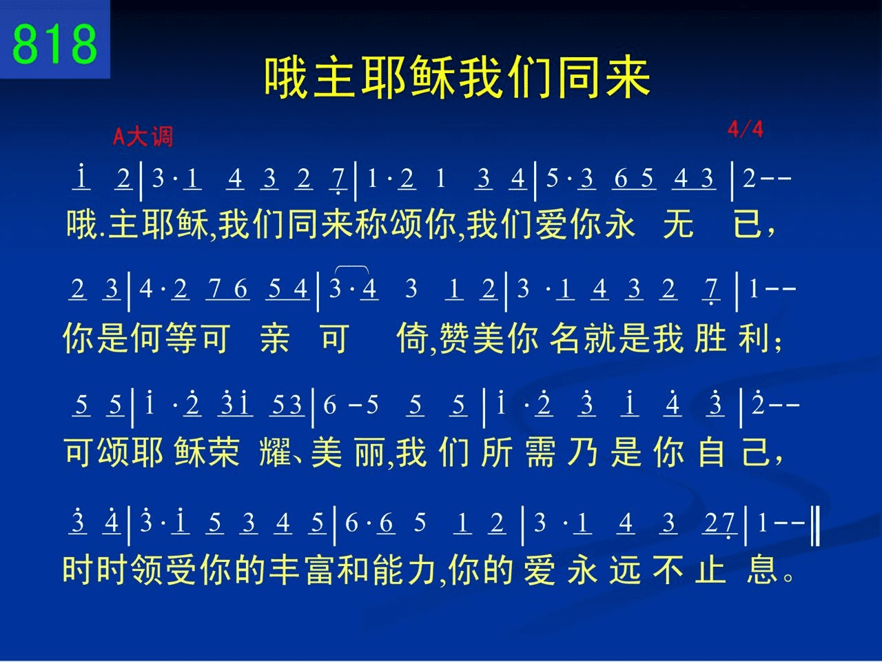 哦,主耶稣,我们同来称颂你,我们爱你永无已,你是何等可亲可倚,赞美你名就是我胜利;可颂耶稣荣耀、美丽,我们所需乃是你自己,时时领受你的丰富和能力,你的爱永远不止息。