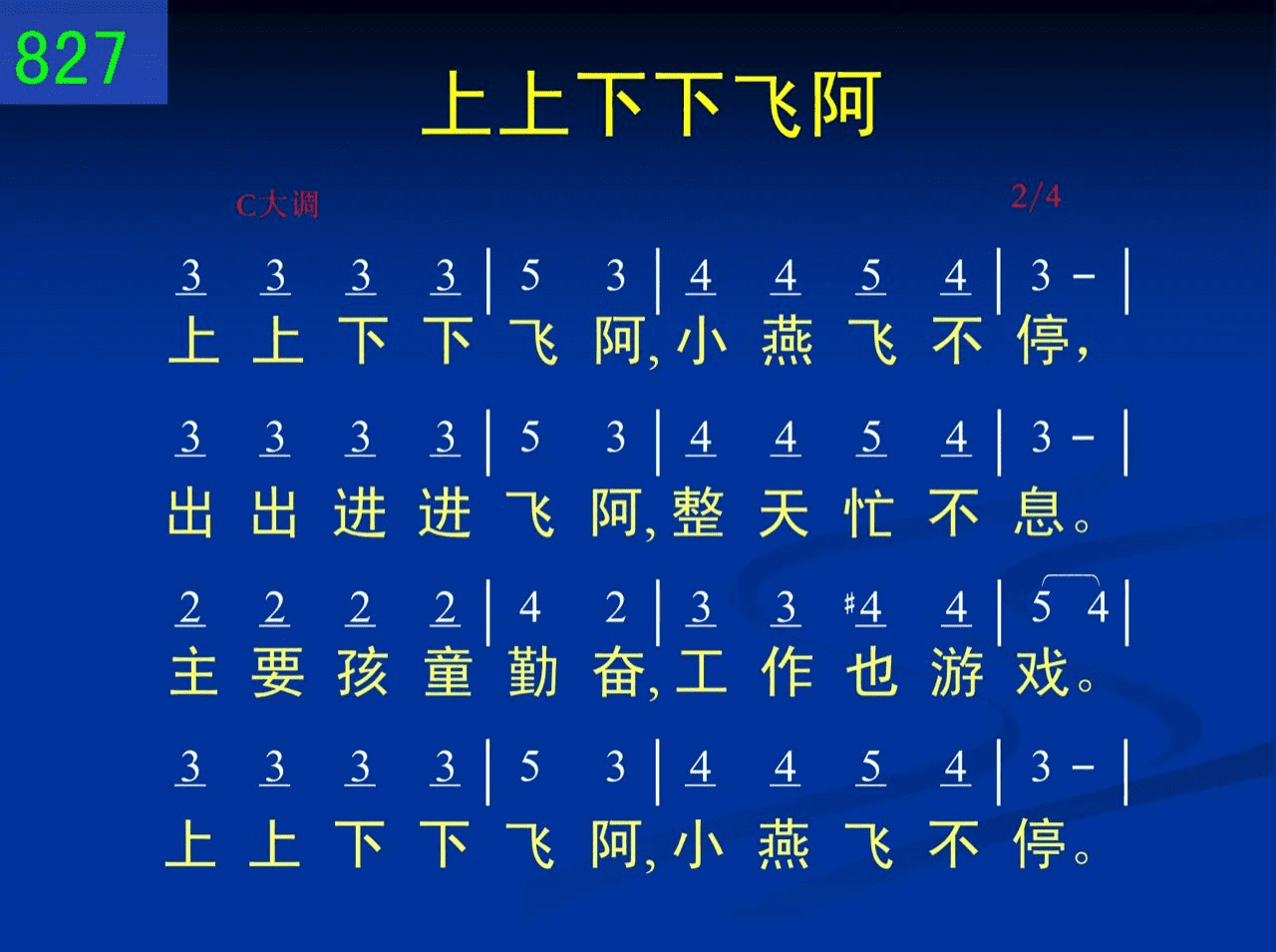 上上下下飞阿,小燕飞不停,出出进进飞阿,整天忙不息。主要孩童勤奋,工作也游戏。上上下下飞阿,小燕飞不停。