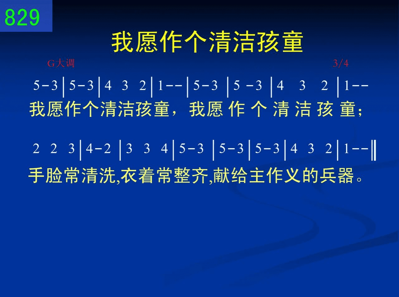 我愿作个清洁孩童,我愿作个清洁孩童;手脸常清洗,衣着常整齐,献给主作义的兵器。