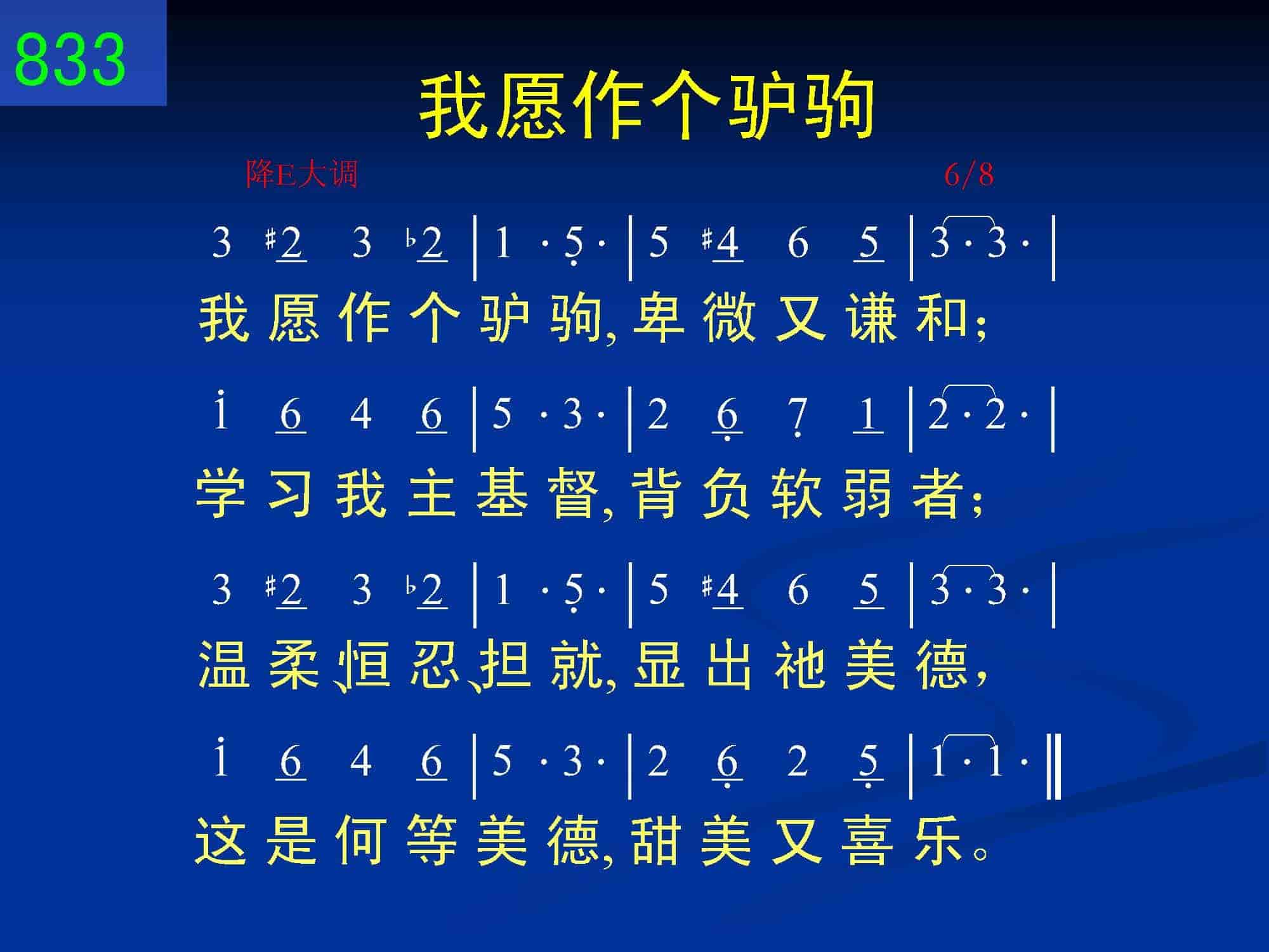 我愿作个驴驹,卑微又谦和;学习我主基督,背负软弱者;温柔、恒忍、担就,显出祂美德,这是何等美德,甜美又喜乐。