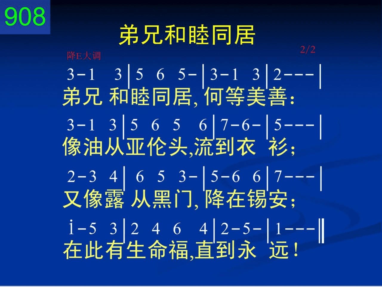 弟兄和睦同居,何等美善;像油从亚伦头,流到衣衫;又像露从黑门,降在锡安;在此有生命福,直到永远。