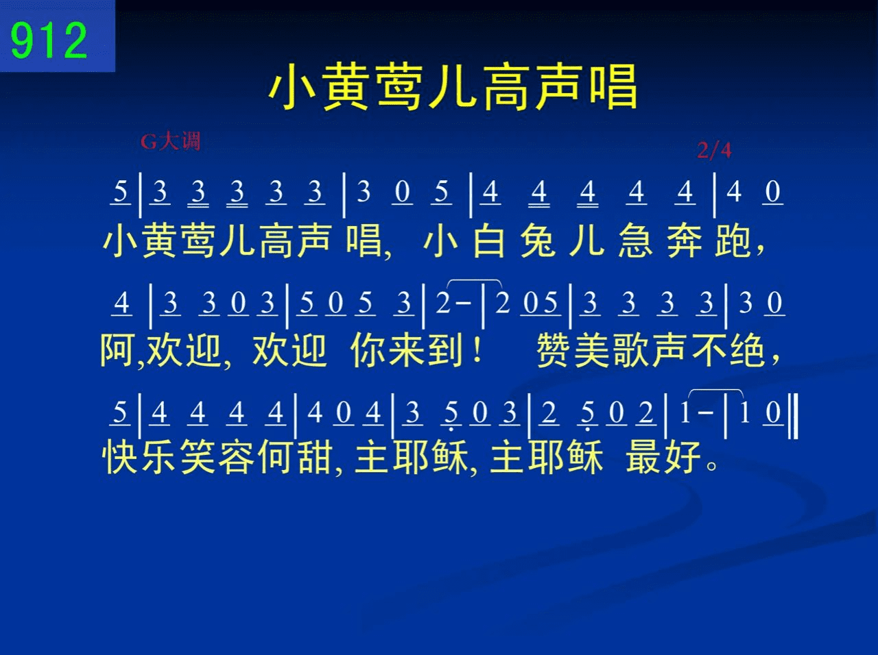 小黄莺儿高声唱,小白兔儿急奔跑,阿,欢迎,欢迎你来到!赞美歌声不绝,快乐笑容何甜,主耶稣,主耶稣最好。