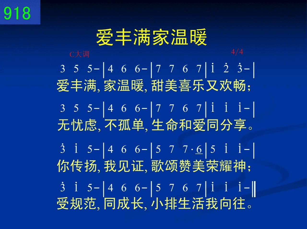 爱丰满,家温暖,甜美喜乐又欢畅;无忧虑,不孤单,生命和爱同分享。你传扬,我见证,歌颂赞美荣耀神;受规范,同成长,小排生活我向往。