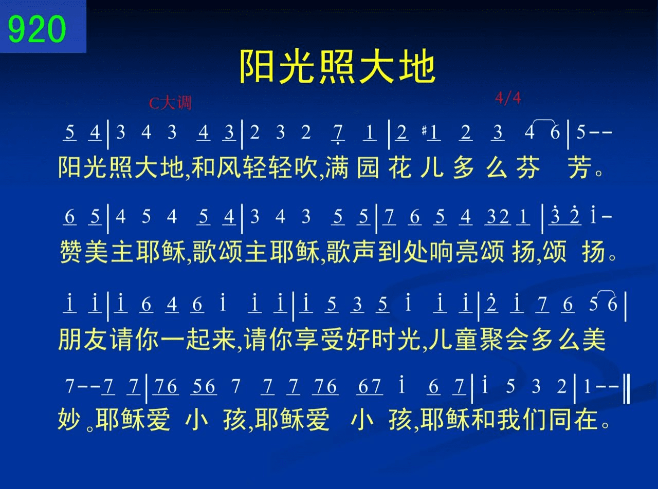 阳光照大地,和风轻轻吹,满园花儿多么芬芳。赞美主耶稣,歌颂主耶稣,歌声到处响亮颂扬,颂扬。朋友请你一起来,请你享受好时光,儿童聚会多么美妙。耶稣爱小孩,耶稣爱小孩,耶稣和我们同在。
