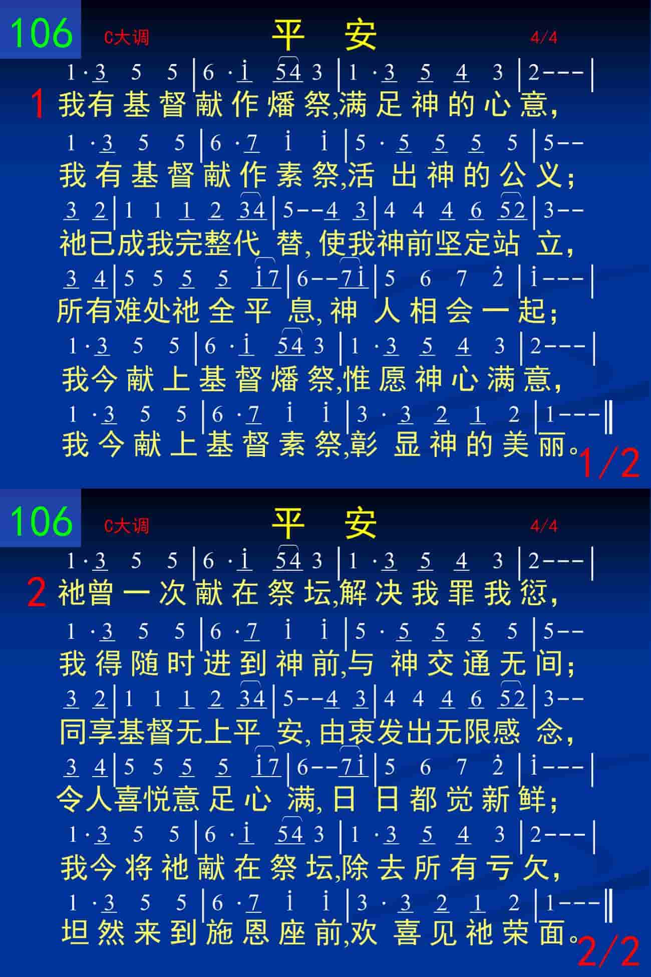 祂曾一次献在祭坛,解决我罪我愆,我得随时进到神前,与神交通无间;同享基督无上平安,由衷发出无限感念,令人喜悦意足心满,日日都觉新鲜;我今将祂献在祭坛,除去所有亏欠,坦然来到施恩座前,欢喜见祂荣面。