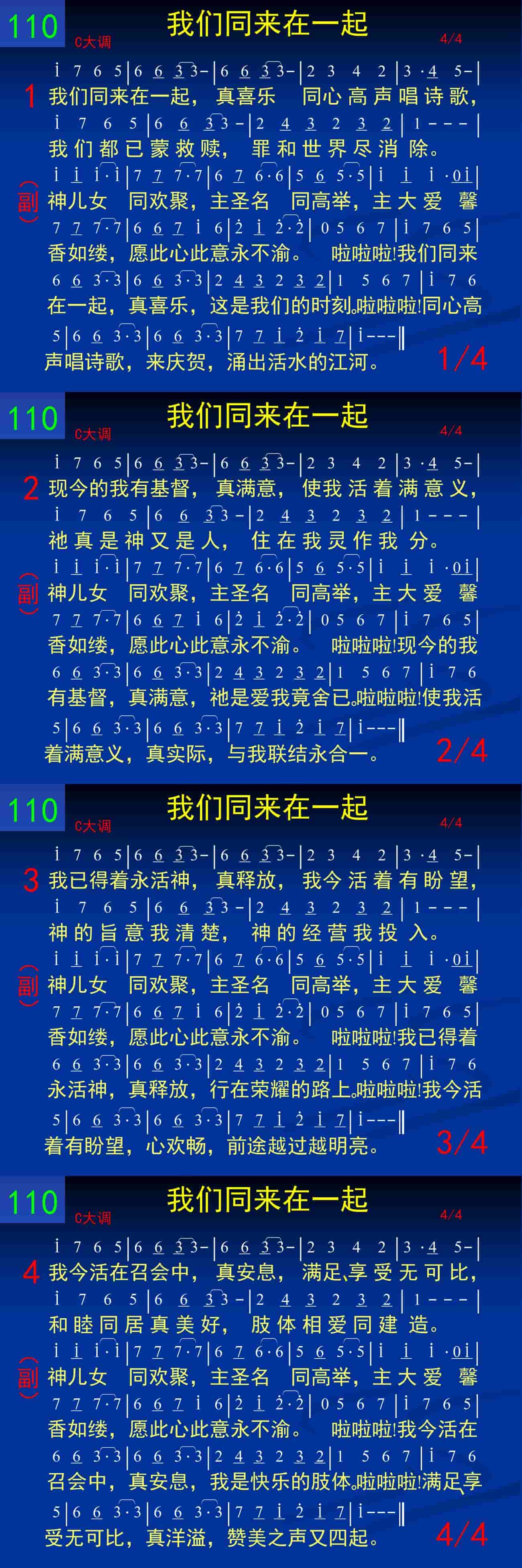 我们同来在一起,真喜乐,同心高声唱诗歌,我们都已蒙救赎,罪和世界尽消除。神儿女同欢乐,主圣名同高举,主大爱馨香如缕,愿此心此意永不渝。啦啦啦!我们同来在一起,真喜乐,这是我们的时刻。啦啦啦!同心高声唱诗歌,来庆贺,涌出活水的江河。