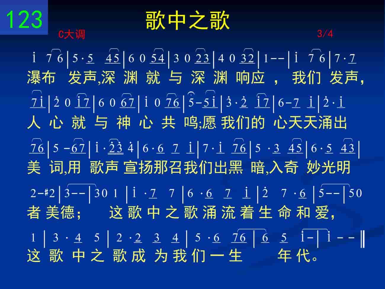 瀑布发声,深渊就与深渊相应,我们发声,人心就与神心共鸣;愿我们的心天天涌出美词,用歌声宣扬那召我们出黑暗,入奇妙光明者美德;这歌中之歌涌流着生命和爱,这歌中之歌成为我们一生年代。