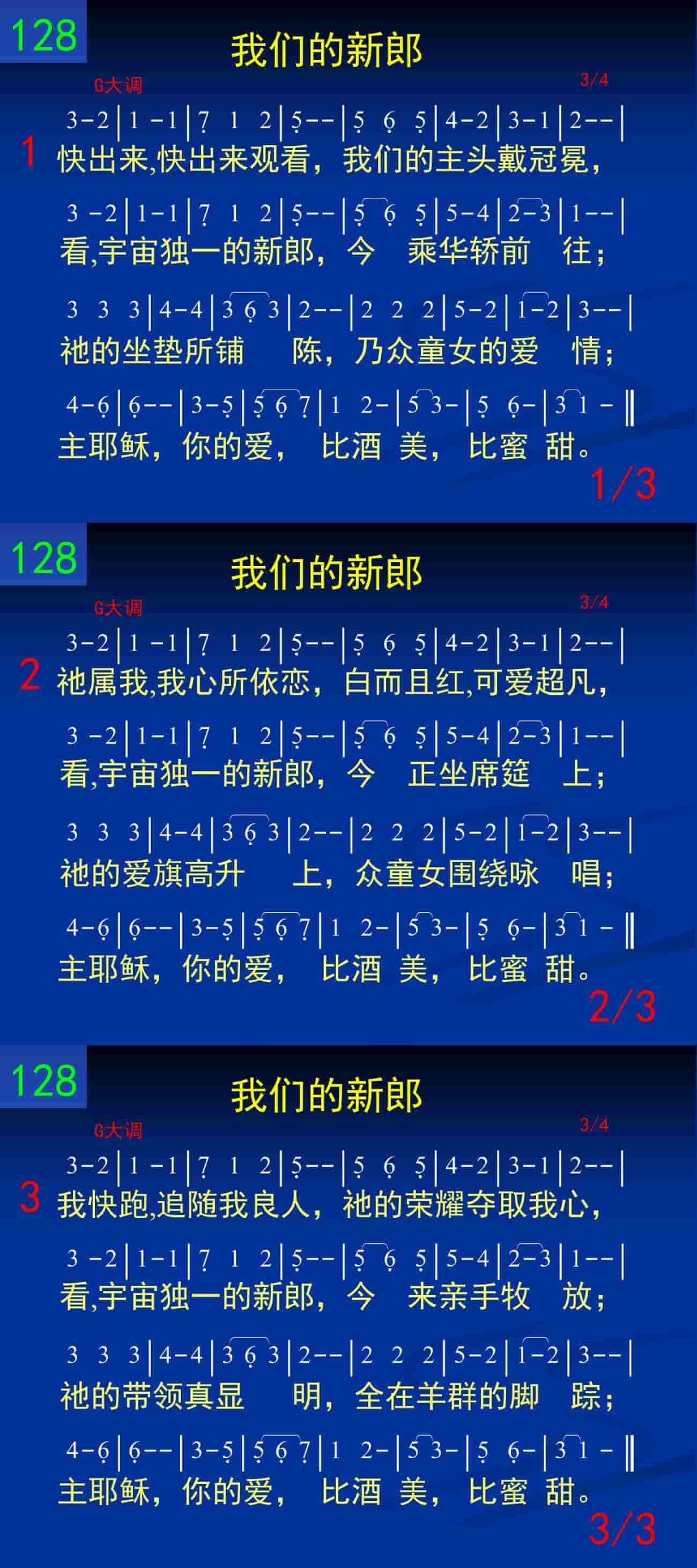 祂属我,我心所依恋,白而且红,可爱超凡,看,宇宙独一的新郎,今正坐席筵上;祂的爱旗高升上,众童女围绕咏唱;主耶稣,你的爱,比酒美,比蜜甜。