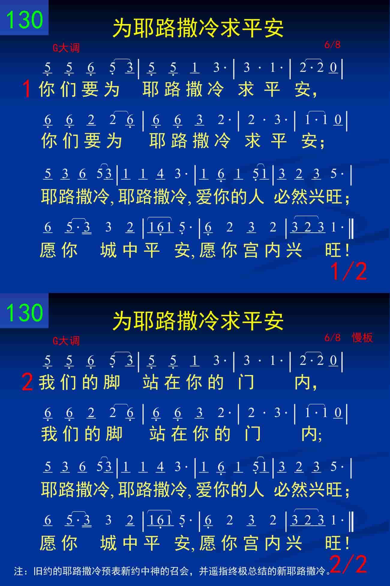 你们要为耶路撒冷求平安,你们要为耶路撒冷求平安;耶路撒冷,耶路撒冷,爱你的人必然兴旺;愿你城中平安,愿你宫内兴旺!