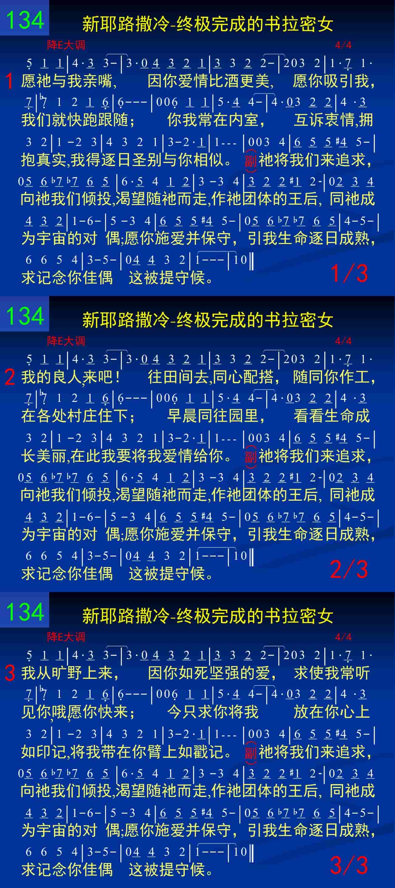 他将我们来追求,向他我们倾投,渴望随他面走,作他团体的王后,同他成为宇宙的对偶;愿你施爱并保守,引我生命逐日成熟,求记念你佳偶这被提守候!