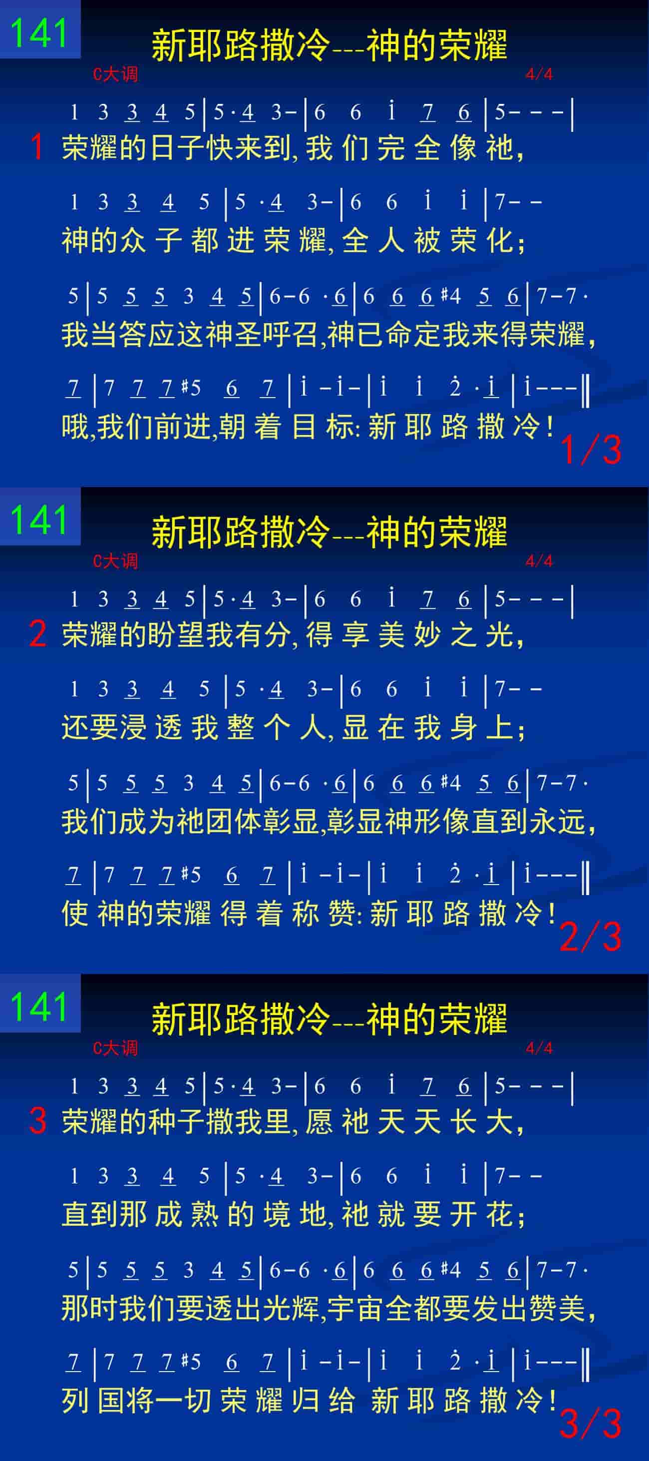 荣耀的日子快来到,我们完全像祂,神的众子都进荣耀,全人被荣化;我当答应这神圣呼召,神已命定我来得荣耀,哦,我们前进朝着目标;新耶路撒冷!