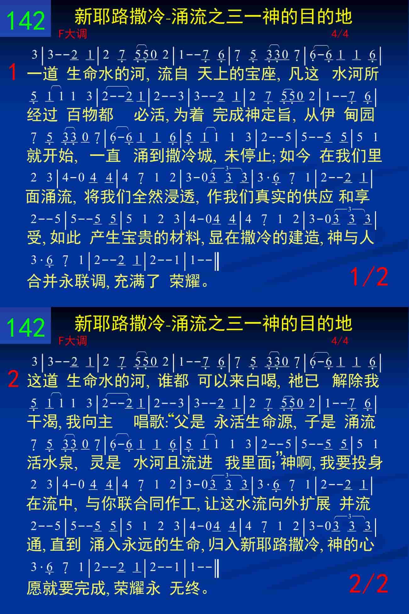 一道生命水的河,流自天上的宝座,凡这水河所经过百物都必活,为着完成神定旨,从伊甸园就开始,一直涌到撒冷城,未停止:如今在我们里面涌流,将我们全然浸透,作我们真实的供应和享受,如此生机宝贵的材料,显在撒冷的建造,神与人合并永联调,充满了荣耀。这道生命水的河,谁都可以来白喝,祂已解除我干渴,我向主唱歌;父是永活生命源,子是涌流活水泉,灵是水河且流进我里面:神啊,我要投身在流中,与你联合同作工,让这水流向外扩展并流通,直到涌入永远的生命,归入新耶路撒冷,神的心愿就要完成,荣耀永无终。